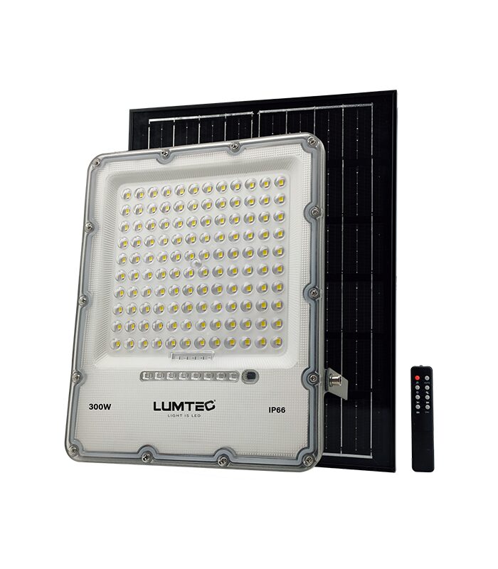 Cette nouvelle gamme de projecteurs solaires LED puissants de 100 à 500 W combine haute performance lumineuse, grande autonomie et conception robuste. Le projecteur LED solaire 300 W est équipé d’un panneau solaire monocristallin haute efficacité et d’une télécommande intelligente, garantissant un éclairage fiable sans aucun raccordement électrique.